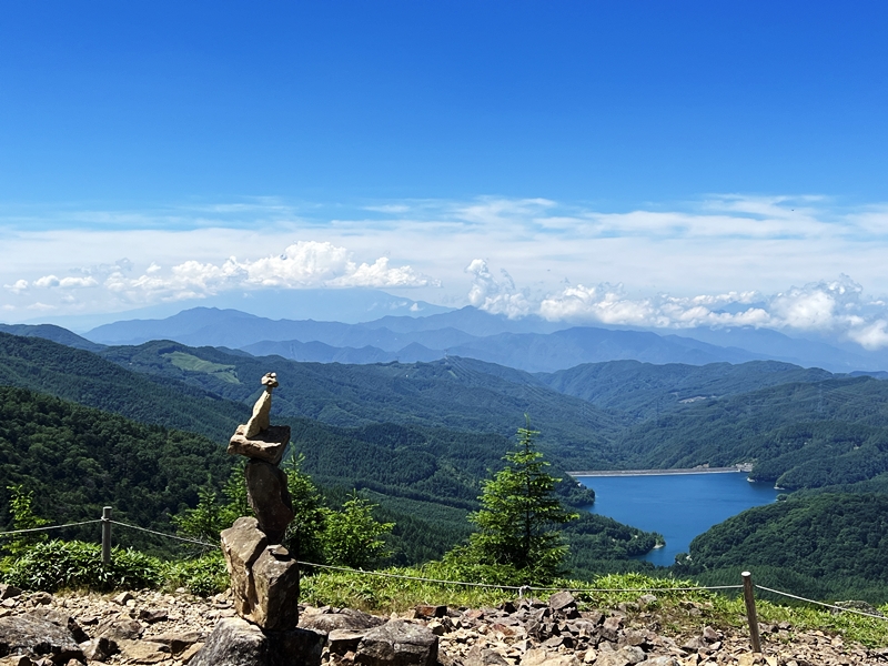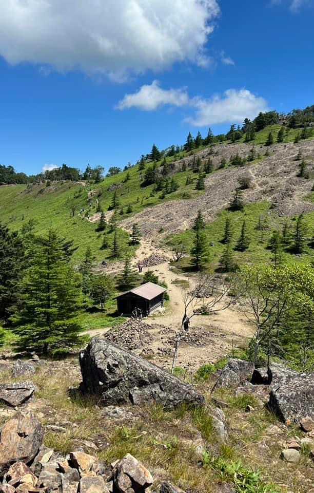 しかし40日ぶりの山歩きのせいか暑さのせいか、調子上がらず、心臓バクバクで少し登っては休むの繰り返し。指先まで汗かいて、スマホも反応しない。手を拭くにも、ウエアも手ぬぐいも湿っていてぜんぜん拭けない。背負っている水約2.5リットルと食料さえ重く胸が苦しい。