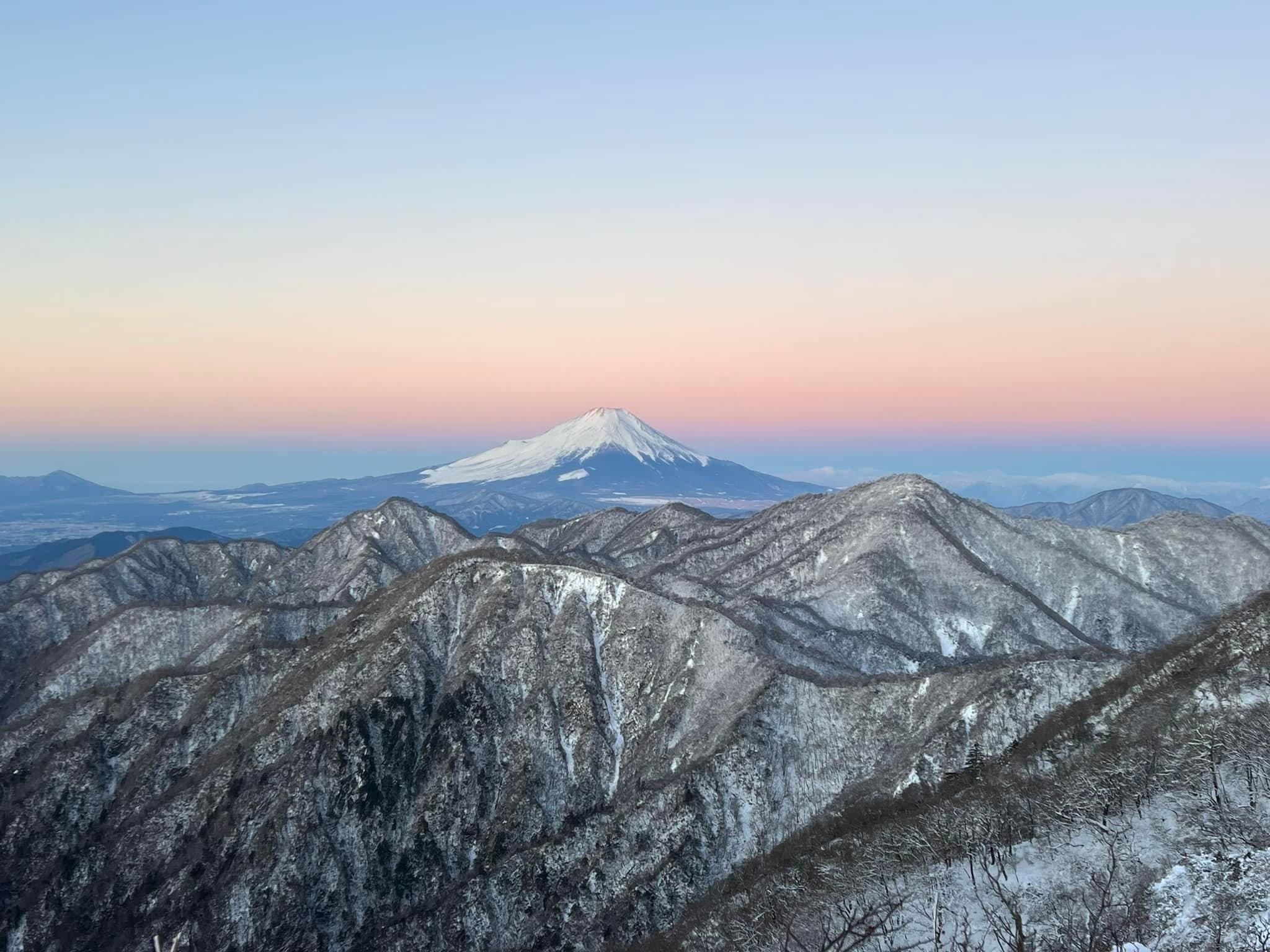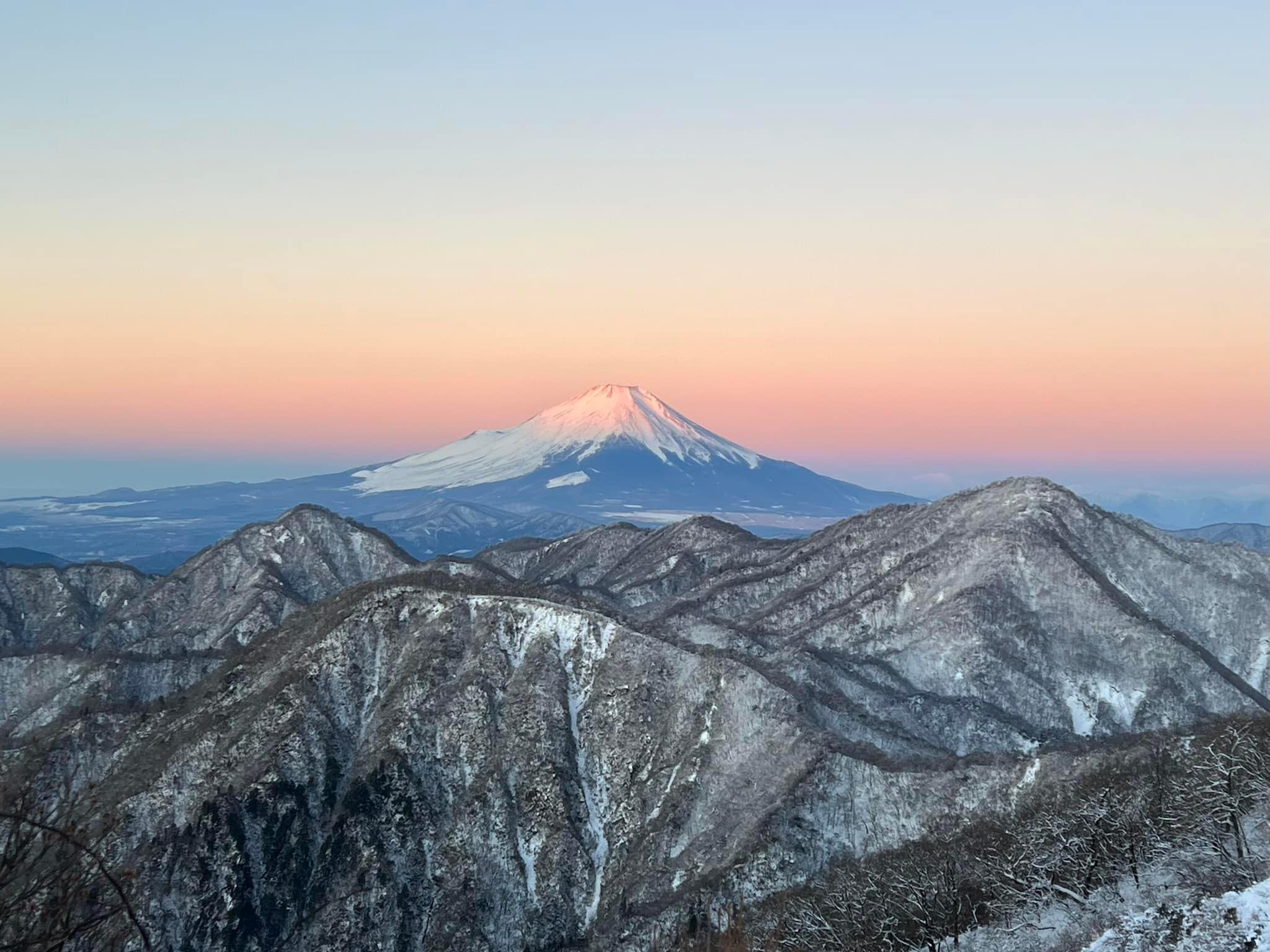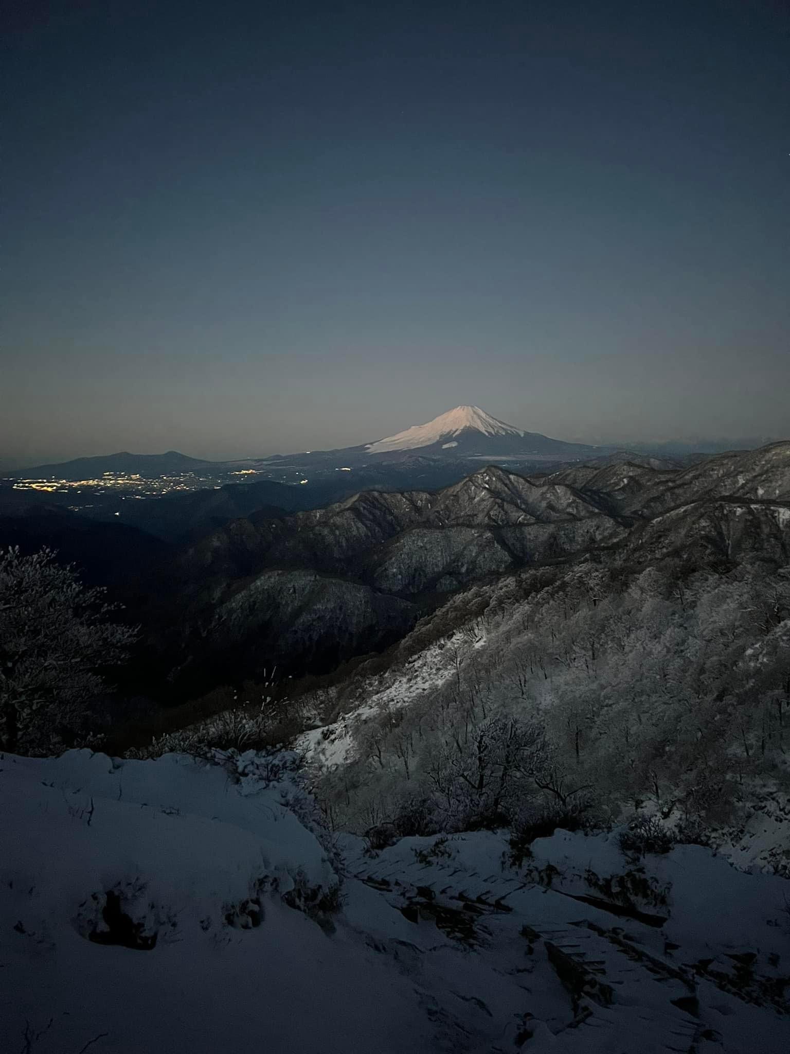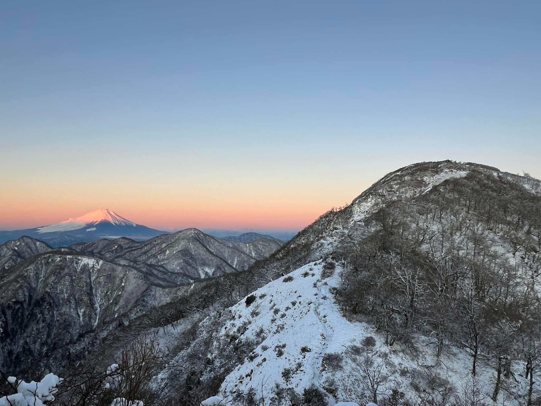 結果、塔ノ岳の前から丹沢山、蛭ヶ岳への稜線、そして北側(相模湖方面)への下山ルートにかけて、2日前に降った雪が思った以上にあったのでペース上がらず中継点にてリタイア。それでも素晴らしい夜明けの景色に出くわし、とても楽しい雪道歩きとなりました。今、最高の気分。
