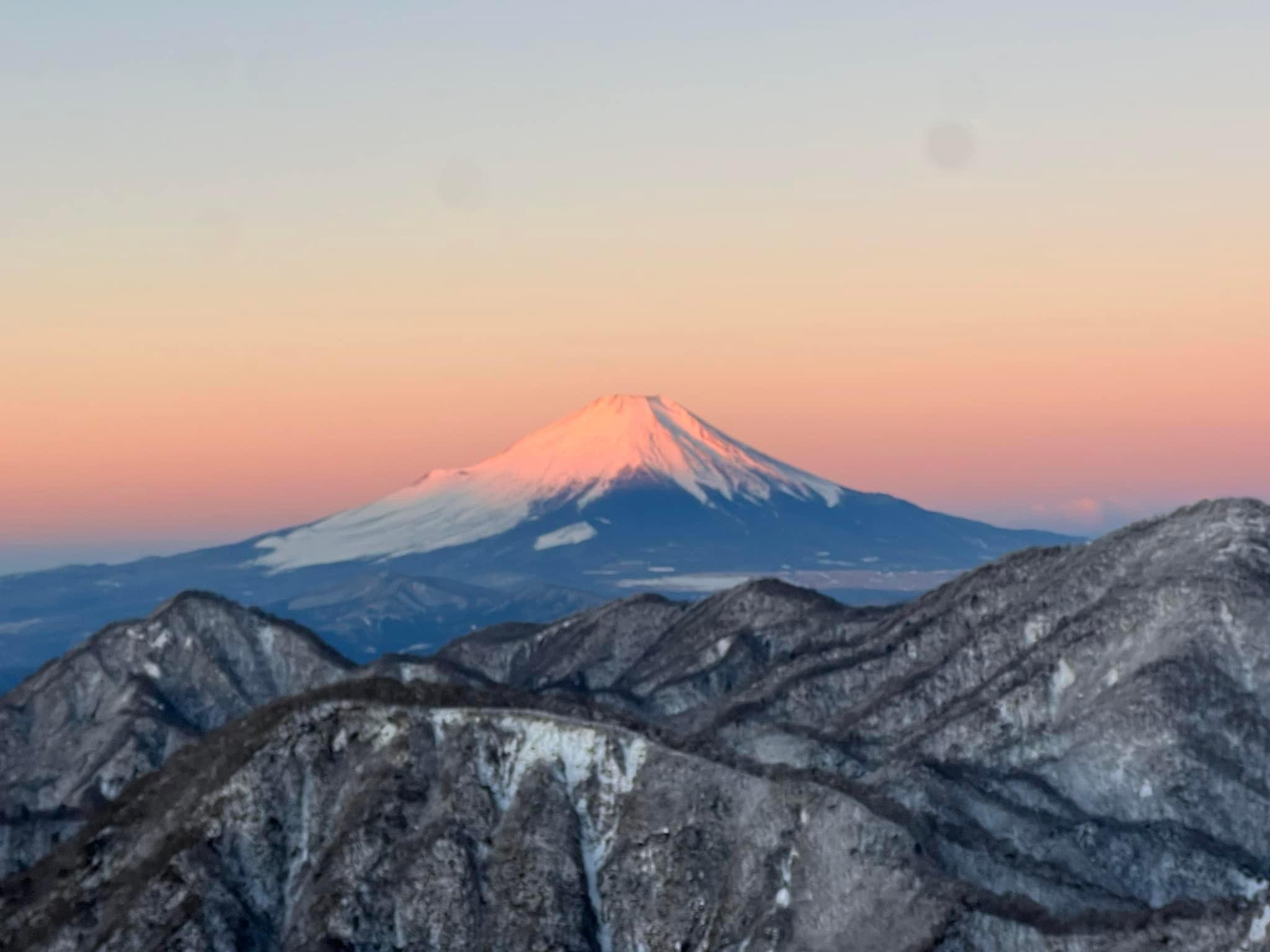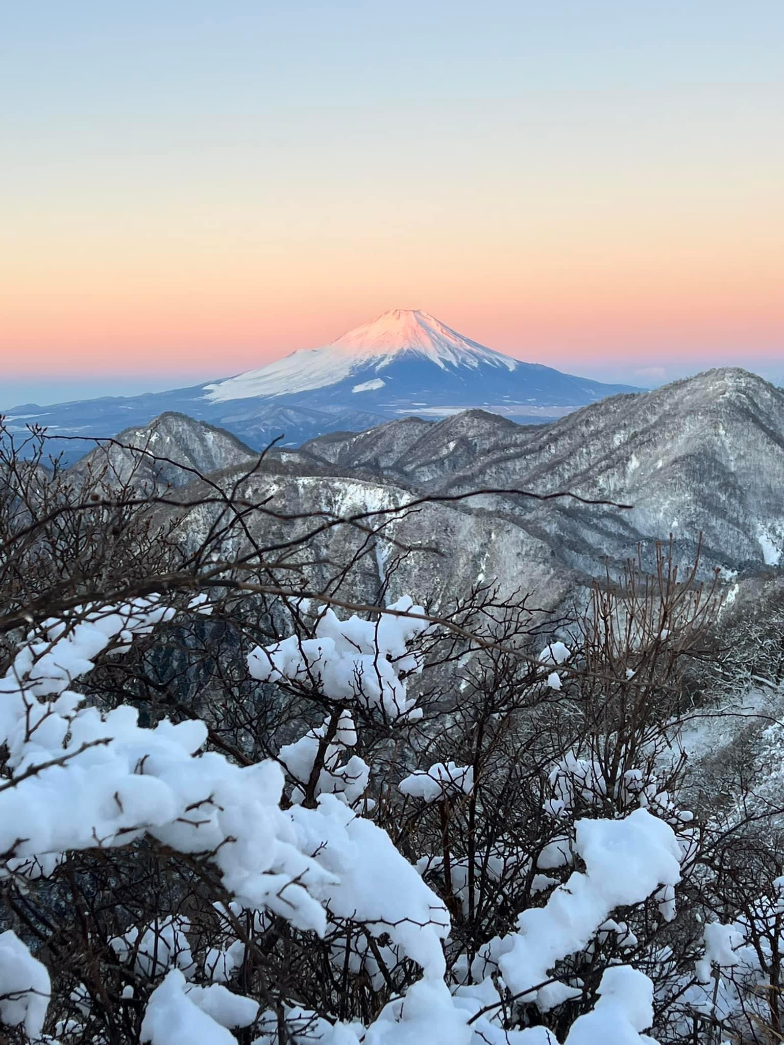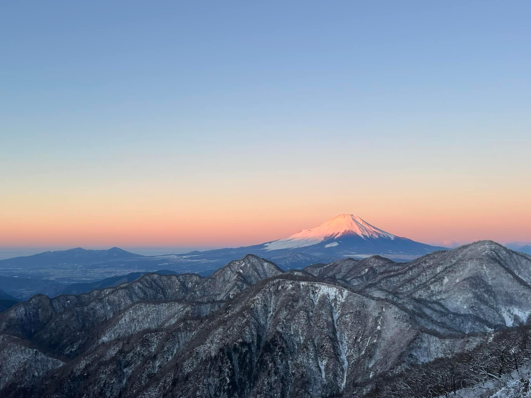 結果、塔ノ岳の前から丹沢山、蛭ヶ岳への稜線、そして北側(相模湖方面)への下山ルートにかけて、2日前に降った雪が思った以上にあったのでペース上がらず中継点にてリタイア。それでも素晴らしい夜明けの景色に出くわし、とても楽しい雪道歩きとなりました。今、最高の気分。