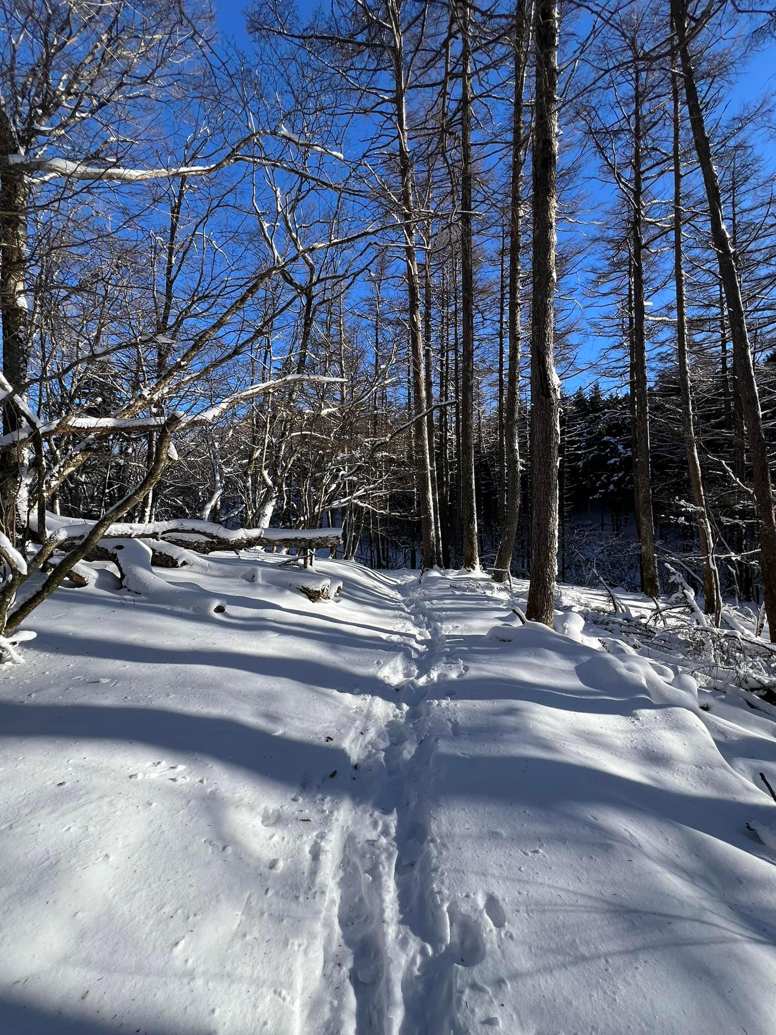 雪深く(10cm位)次第にトレースも無くなったので、チェーンスパイクではなく、軽アイゼンがあればなお良かった。